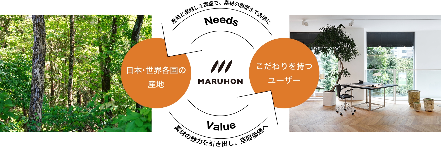 国内外の強力なネットワークと、環境・社会に配慮した木材調達。マルホンは、FSC®認証製品の調達・加工を通じて、責任ある森林管理を支援しています。