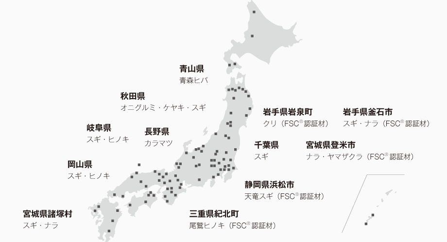国産材・地域材の指定にも柔軟に対応。地産地消の木質空間や無垢材の新たな用途開発など、サステナブルなものづくりを推進します。