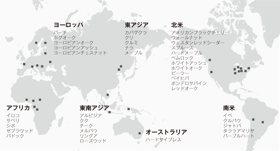 マルホンでは、調達をすべて自社で行い、商社を介さず世界約30ヶ国に独自の木材流通ルートを構築。